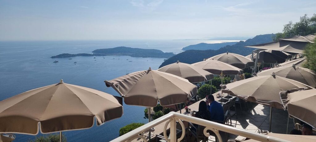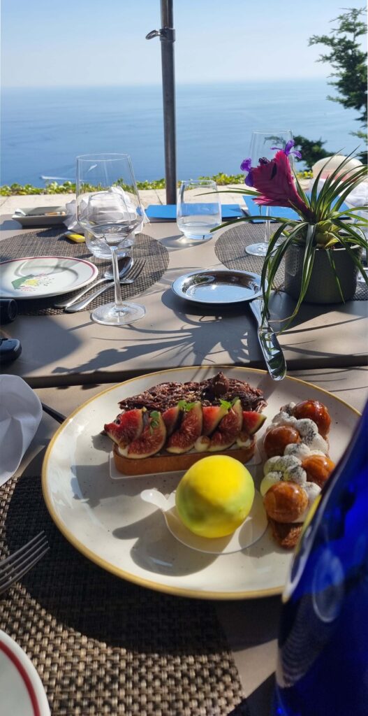 Der Höhepunkt unseres Aufenthalts im Hôtel Château de La Chèvre d’Or war zweifellos das unfassbar gute Essen auf der Terrasse des Restaurants. Der Blick von hier oben auf das funkelnde Mittelmeer und die umliegenden Dörfer ist einfach atemberaubend. Die Sonne ging langsam hinter dem Horizont unter, und wir genossen den romantischen Moment.